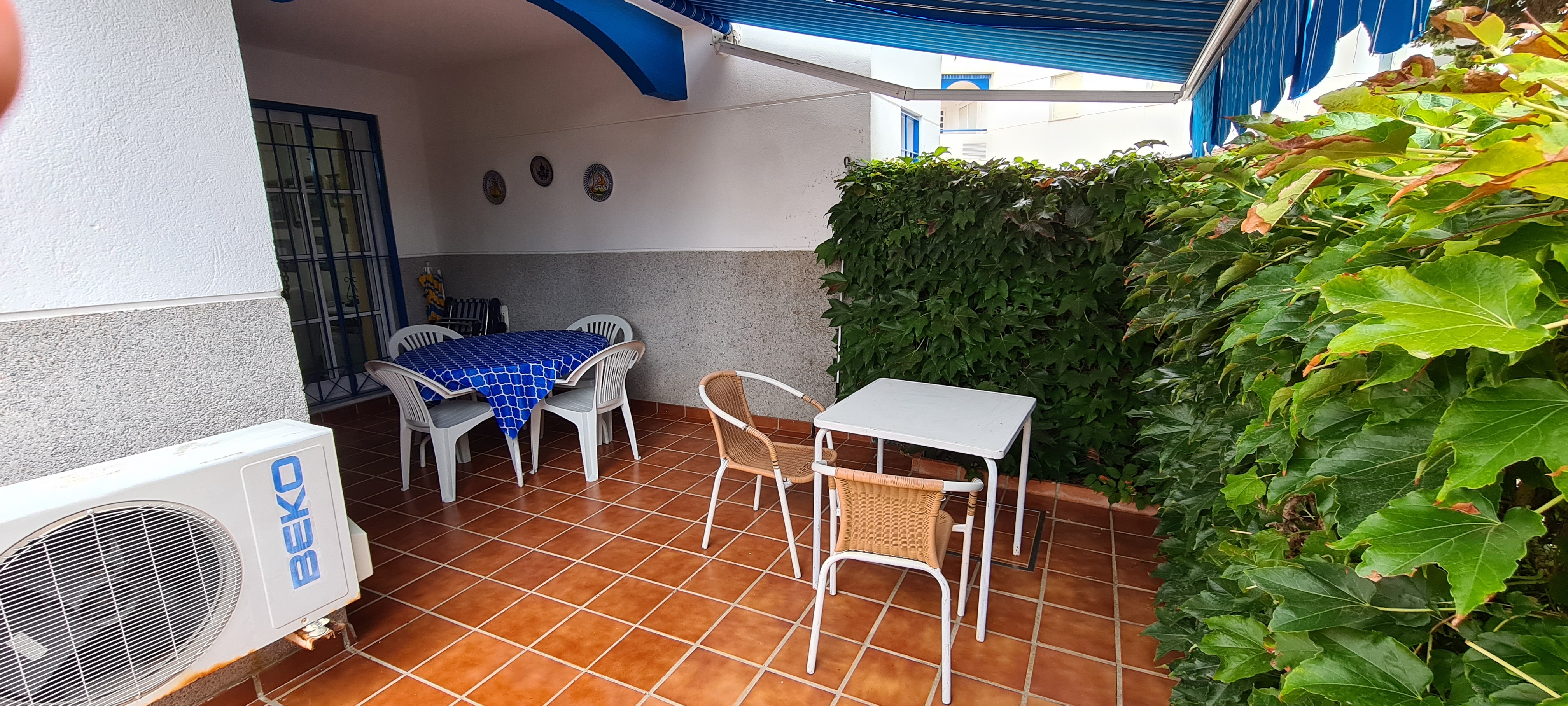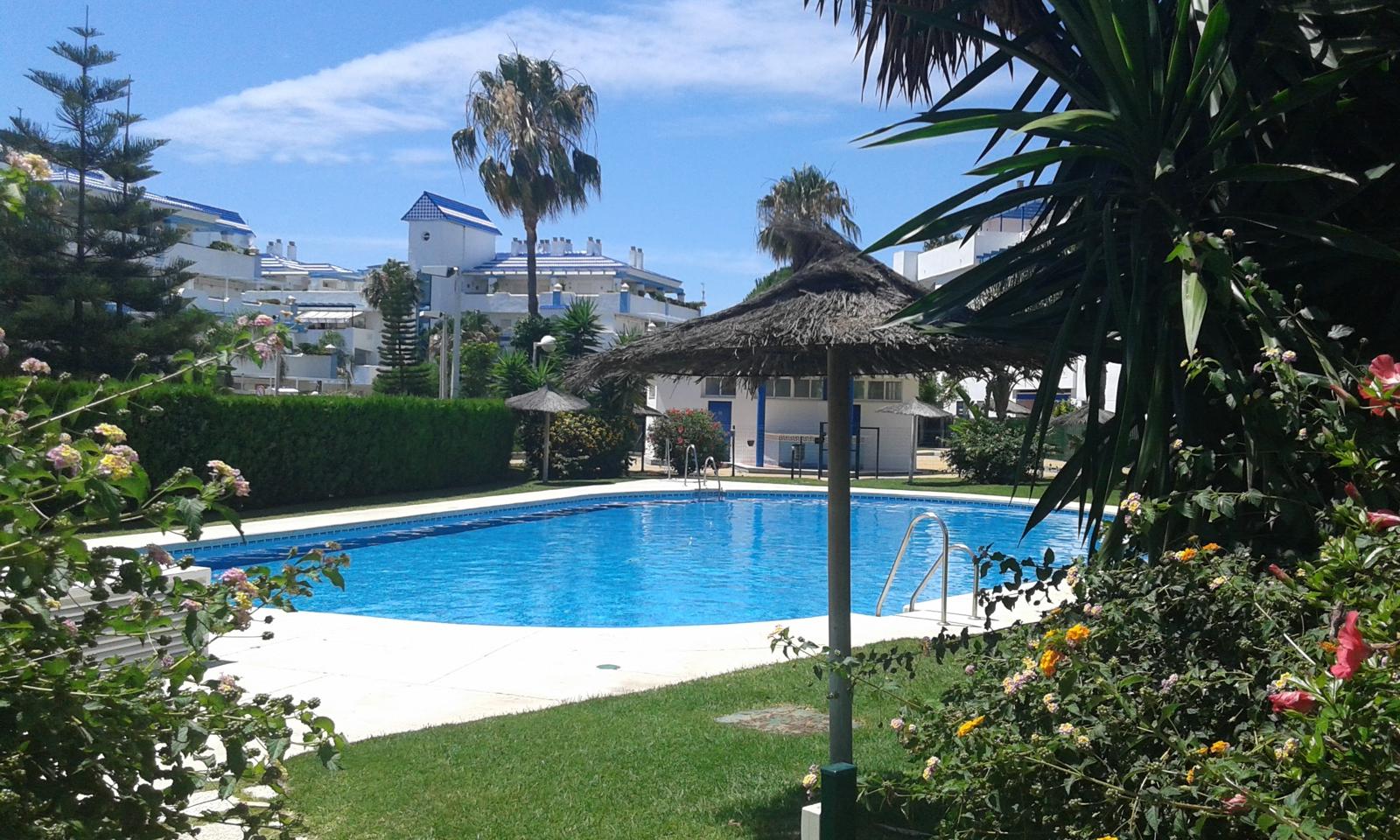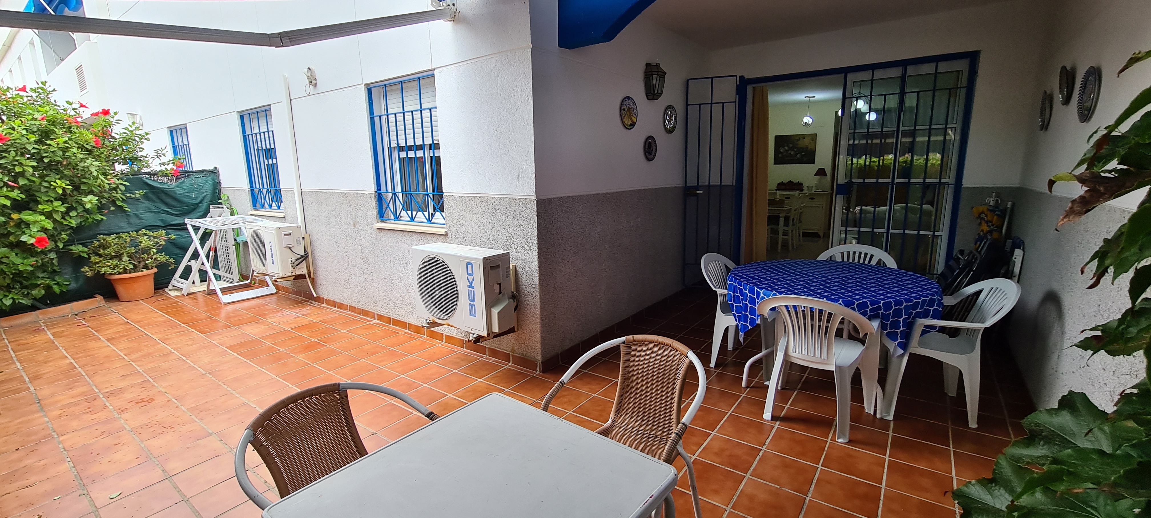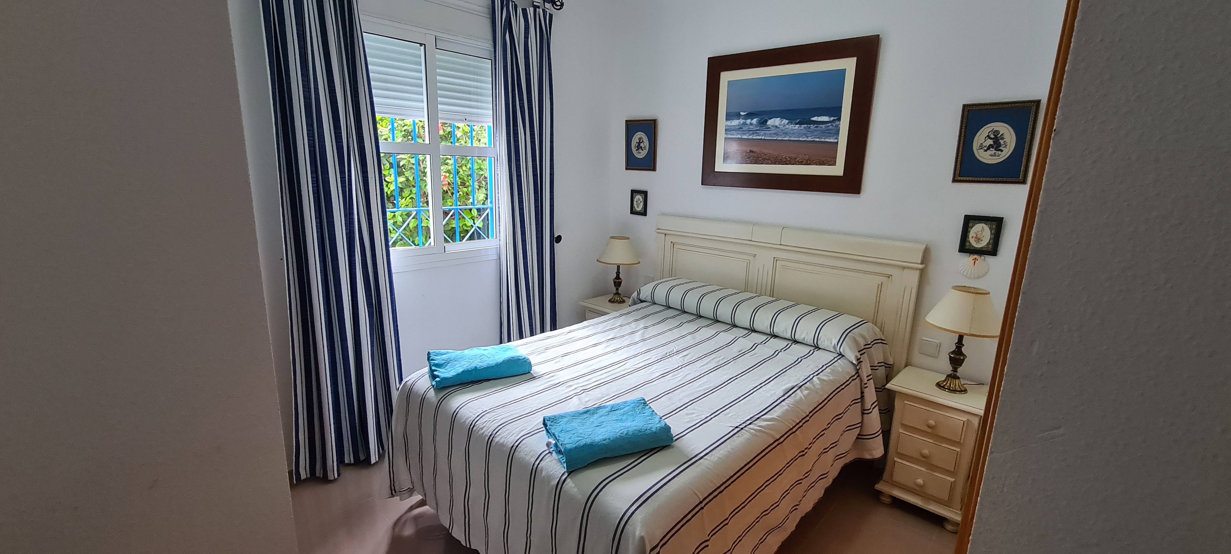 Apartamento bajo con jardín. Consta de 3 dormitorios, principal con cama de matrimonio y baño incorporado, dos dormitorios con dos camas cada uno , salón-comedor (no tiene sofá cama) cocina equipada: lavadora, lavavajillas, cocina, frigorífico, microondas y todos los pequeños electrodomésticos., televisión, 2º baño con ducha, aire acondicionado, plaza de garaje subterránea. |