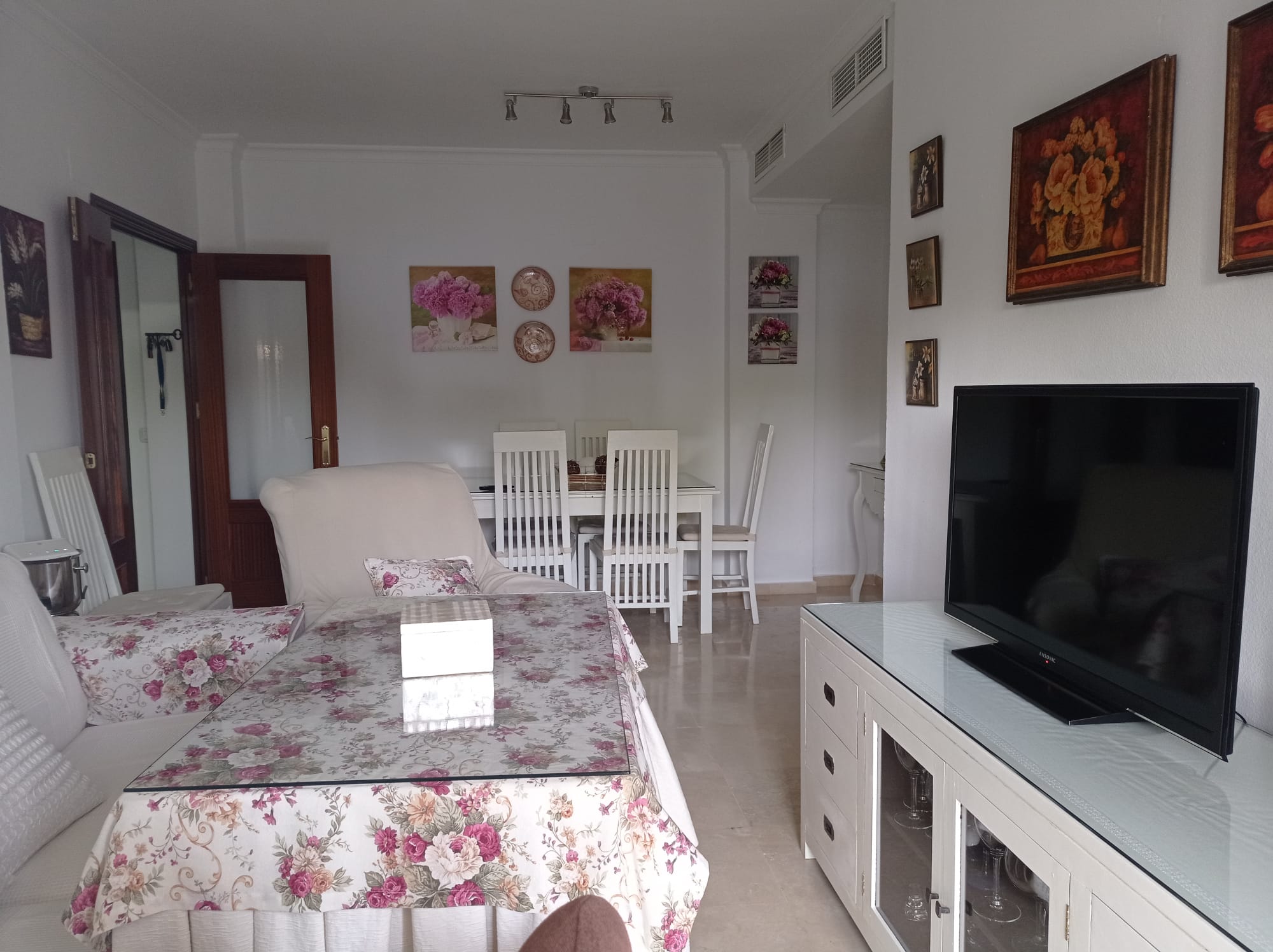Apartamento en 2ª planta de 3 dormitorios con Terraza hacia el paseo del río que une los dos lagos. Consta de dormitorio con cama de matrimonio, dos dormitorios con dos camas, dos baños (uno con bañera y otro con ducha), cocina equipada, terraza y plaza de garaje. En urbanización con jardines y amplia piscina. Wifi.